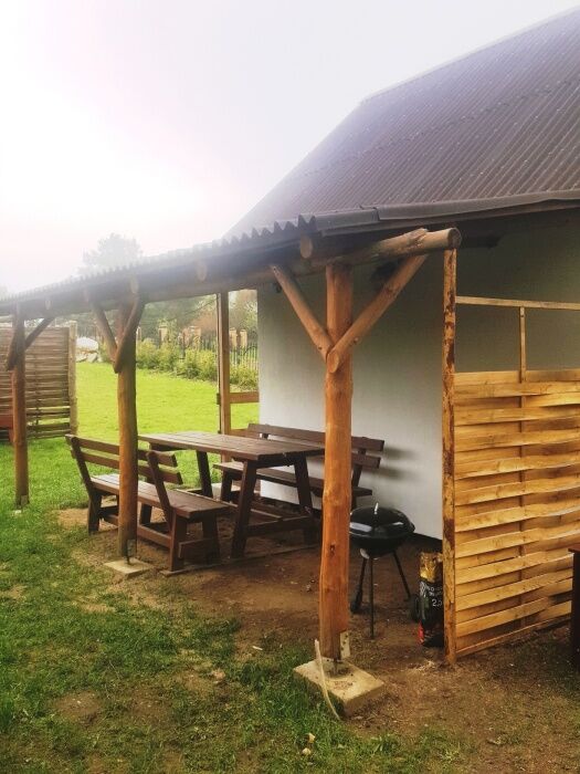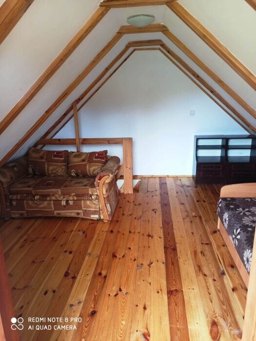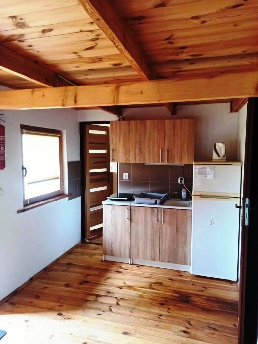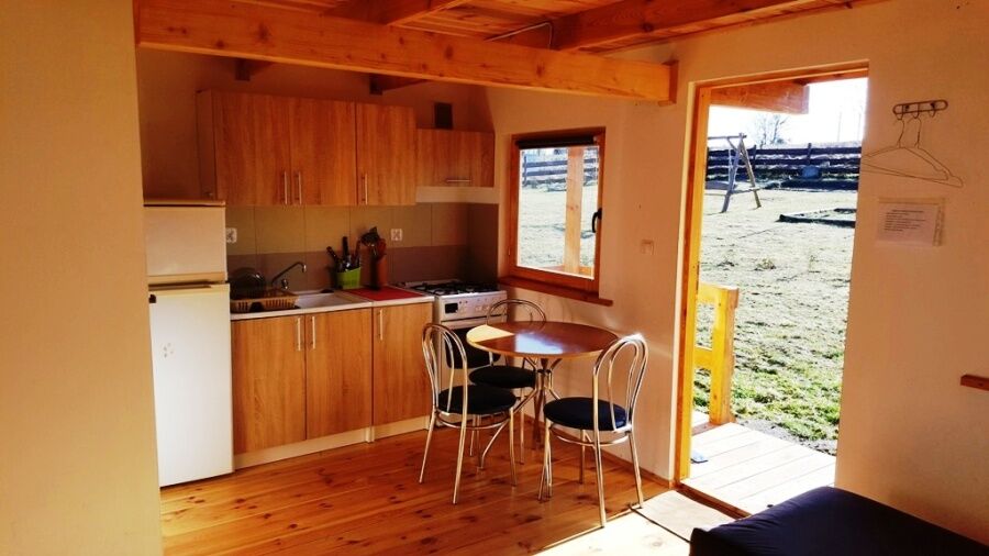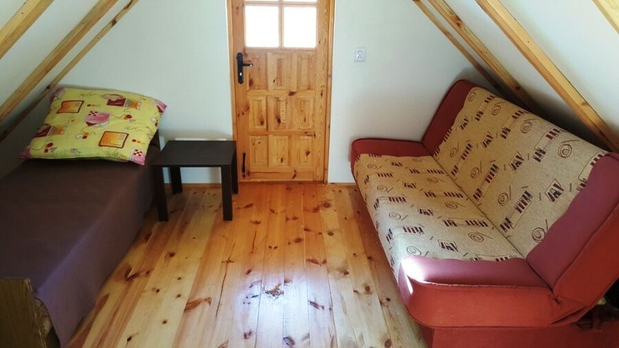 W domku znajduje się salon z aneksem kuchennym, łazienką ,oraz 2 pokoje ( jeden na parterze drugi na poddaszu).